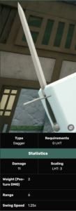- Overview: A quick and versatile weapon, the stiletto is ideal for players who prefer speed over raw damage. It offers a balanced mix of agility and offense, allowing you to quickly attack and evade. The speed of the stiletto makes it particularly useful for those who rely on fast, successive strikes.