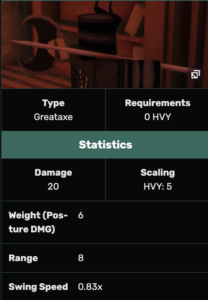 - Overview: A large and heavy weapon, the greataxe is designed for players who prefer raw power over speed. It has slower attack speeds but compensates with devastating damage and a wide area of effect. The greataxe can stagger enemies, allowing you to control the flow of combat.